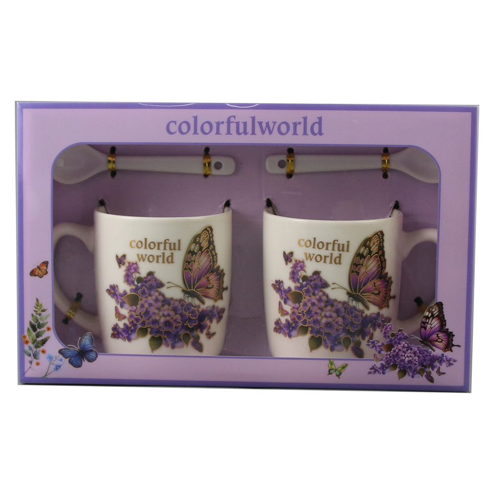 Set 2 cani cu lingurite, din ceramica „Colorful World”, 200 ml, Fluturasi