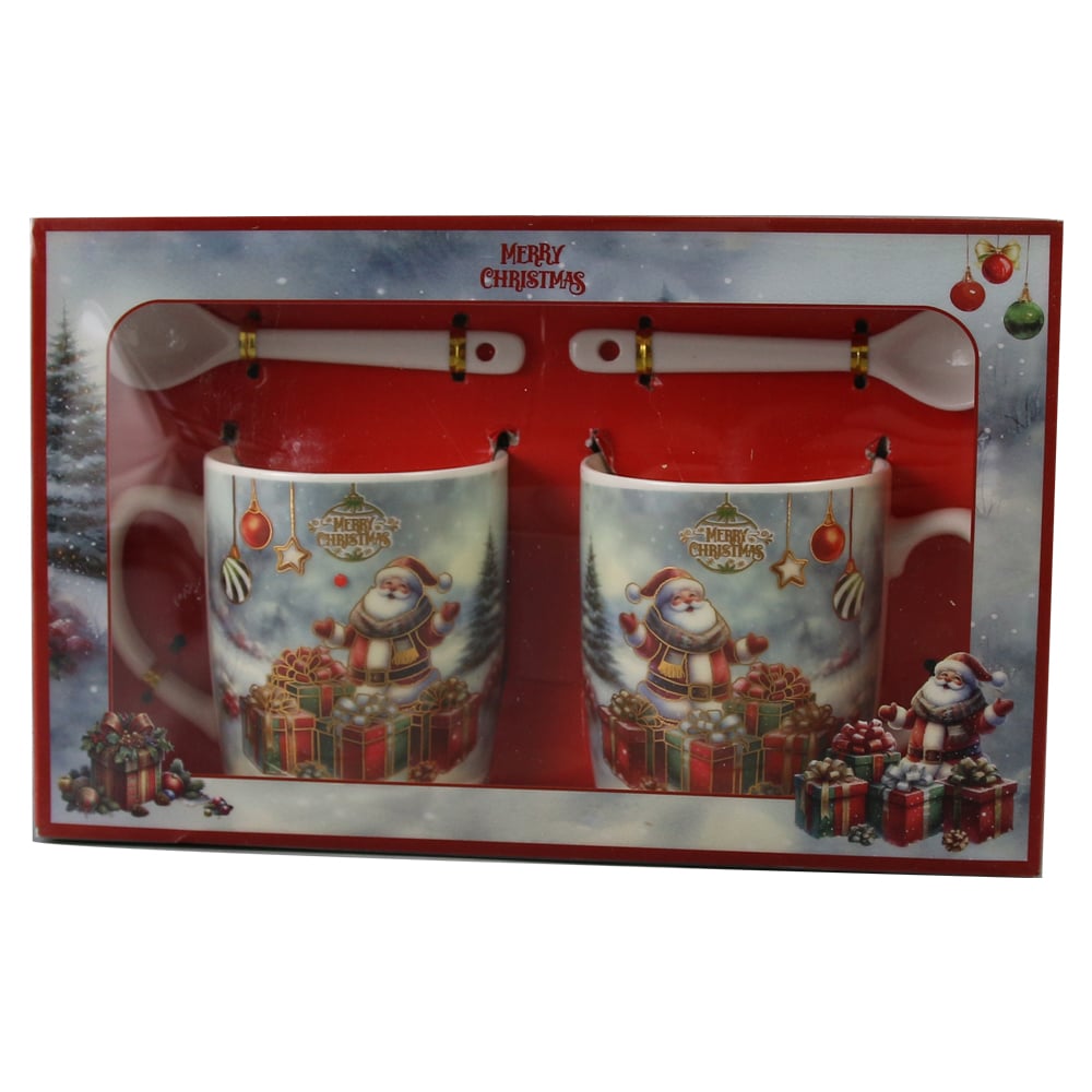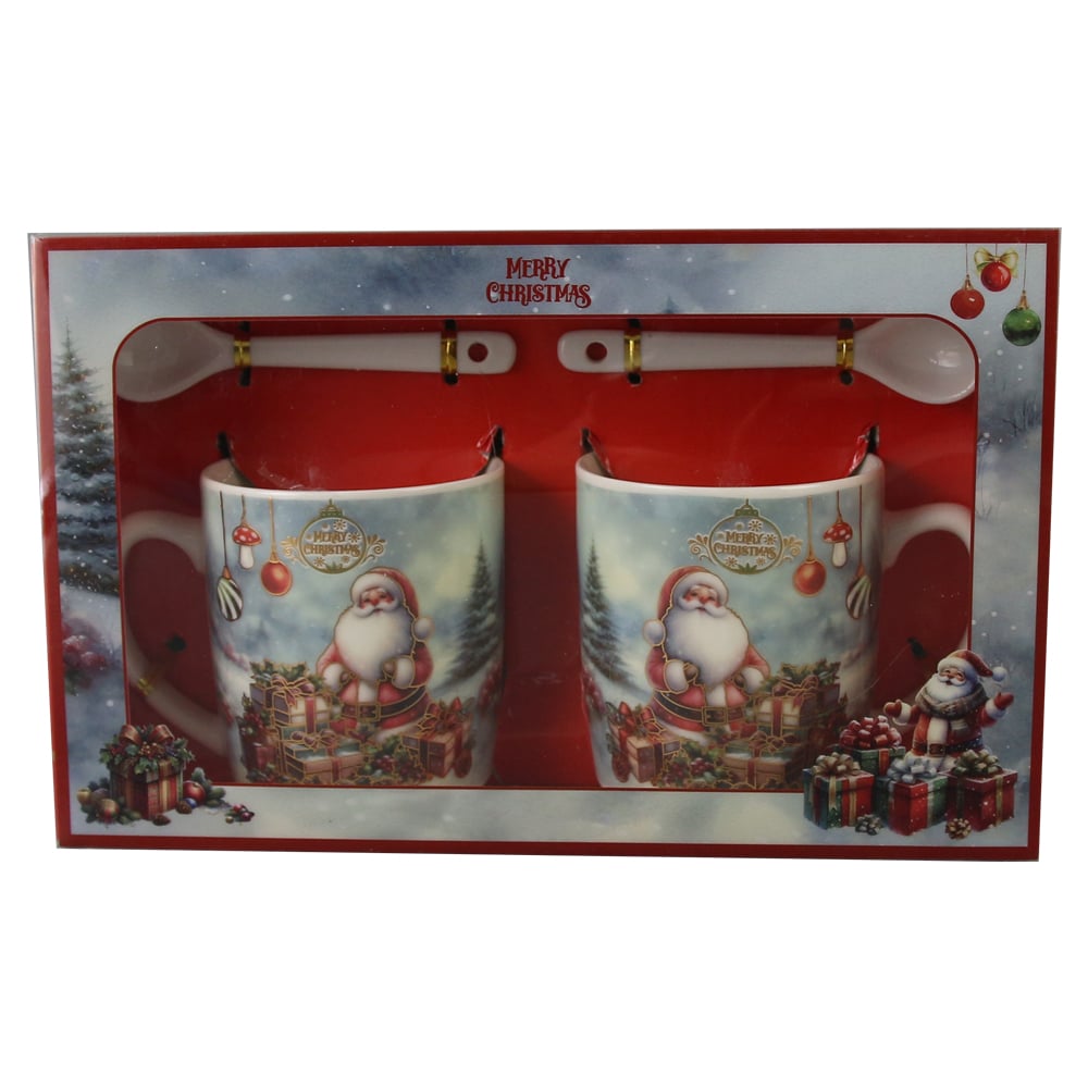 Set 2 cani de Craciun cu lingurite, 200 ml, „Merry Christmas”, Mos cu cadouri