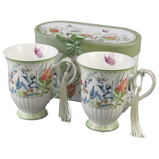 Set 2 cani din ceramica, cu franjuri, 300 ml, Flori de camp, in cutie decorativa