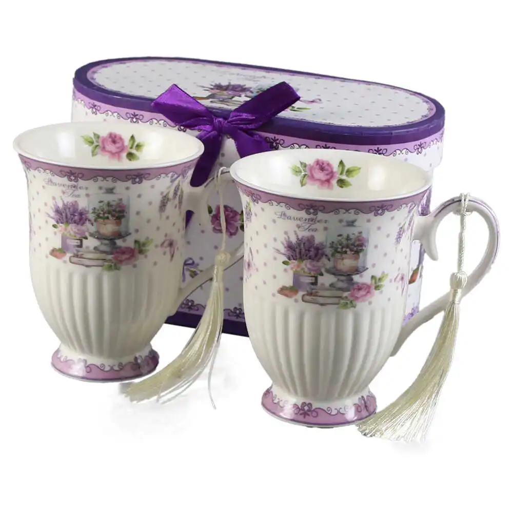 Set 2 cani din ceramica, „Lavender Tea”, 300 ml, cu franjuri, in cutie cadou