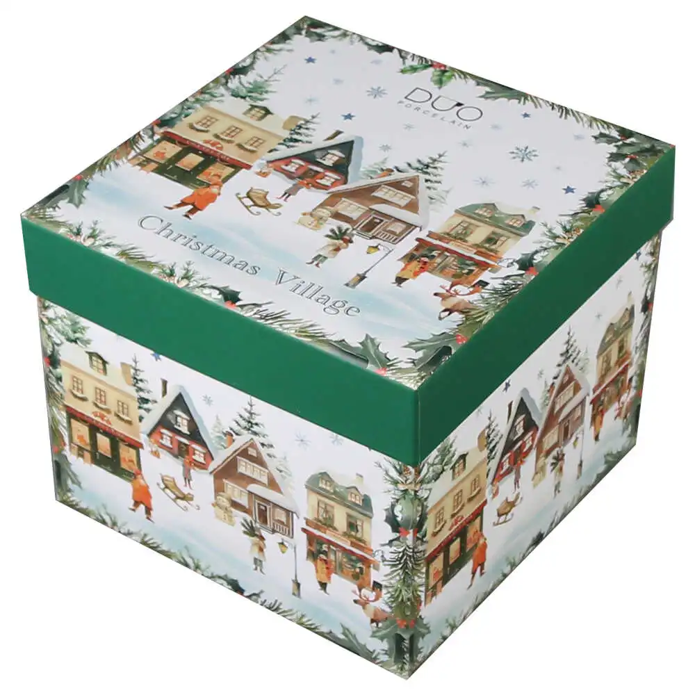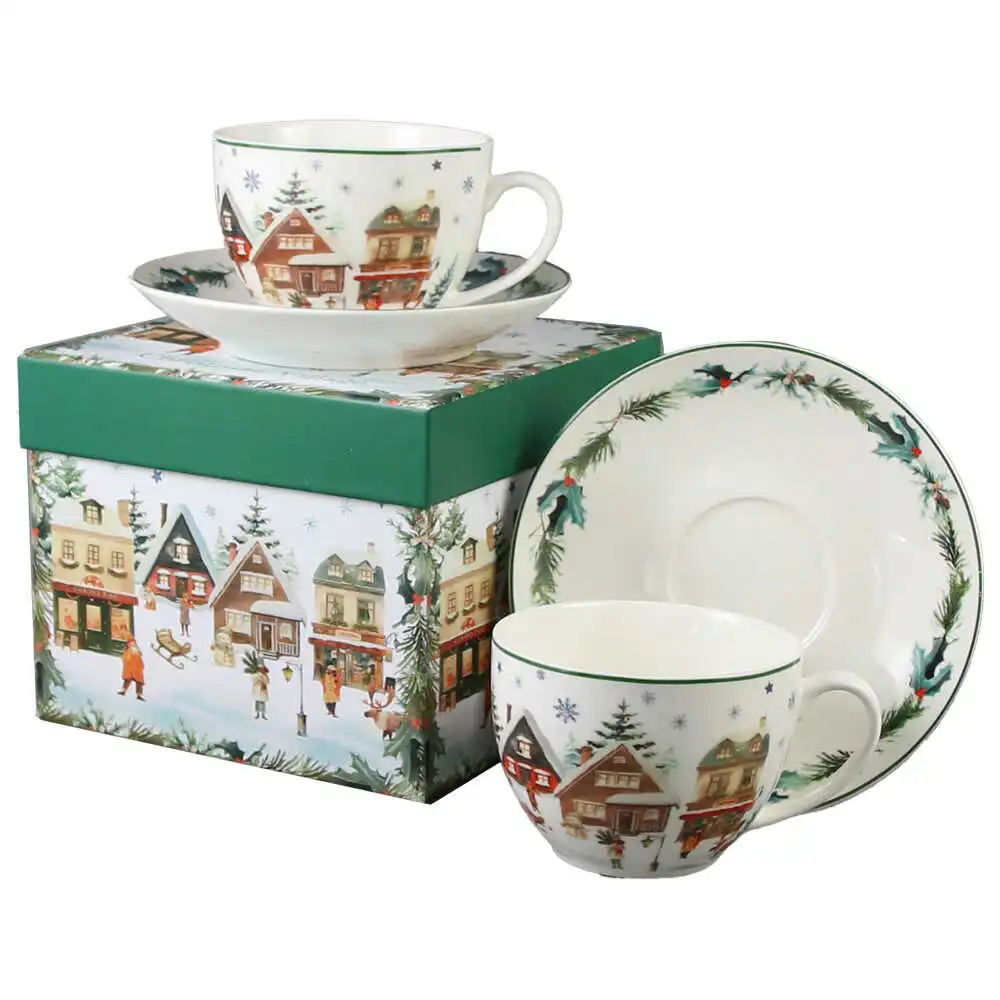 Set 2 cesti cu farfurii, din portelan, Christmas Village, 270 ml, in cutie decorativa, Sat de Craciun