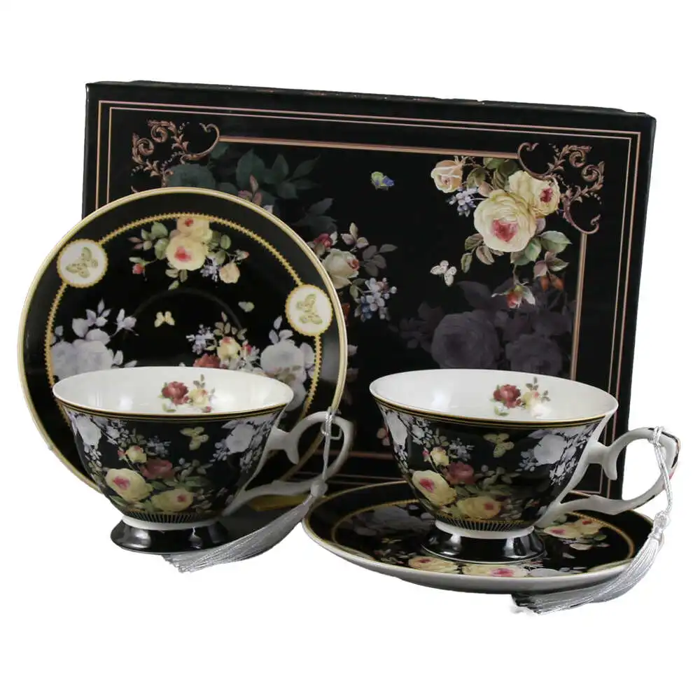 Set 2 cesti din ceramica cu farfurii, 150 ml, in cutie cadou, Flori, negru