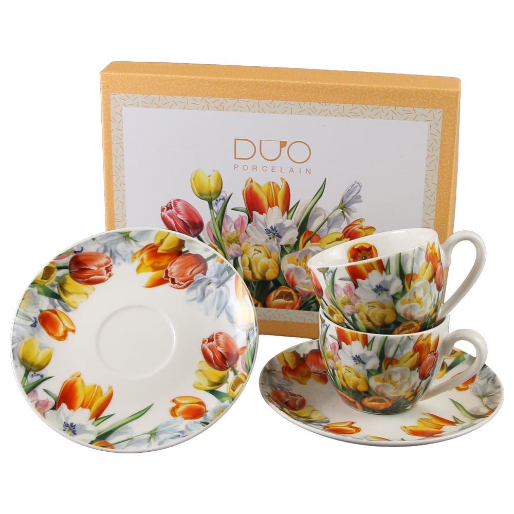 Set 2 cesti espresso cu farfurii din portelan 110 ml „Tulipany” in cutie decorativa