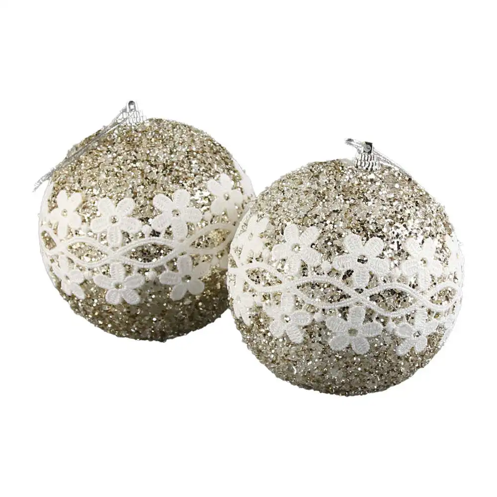 Set 2 globuri pentru brad din foam 10 CM, cu glitter auriu si dantela