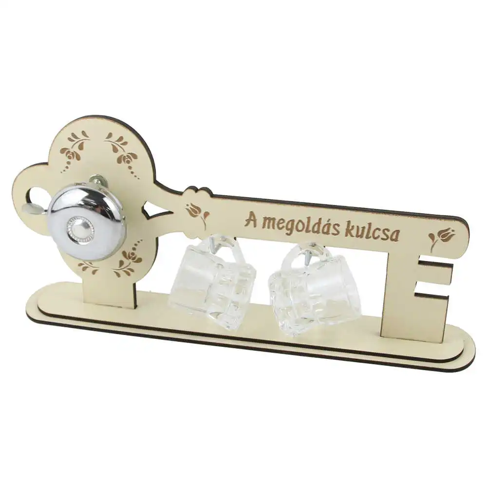 Set 2 pahare shot „A megoldas kulcsa” cu suport din lemn si clopotel, 30×14 CM