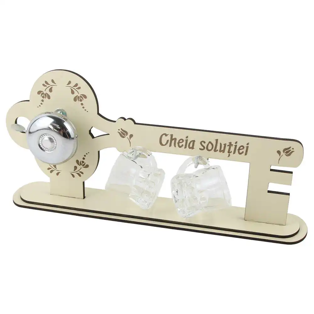 Set 2 pahare shot „Cheia solutiei” cu suport din lemn si clopotel, 30×14 CM