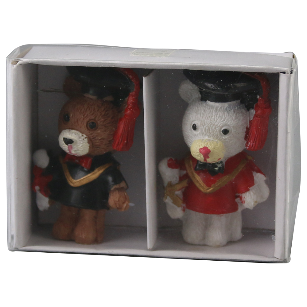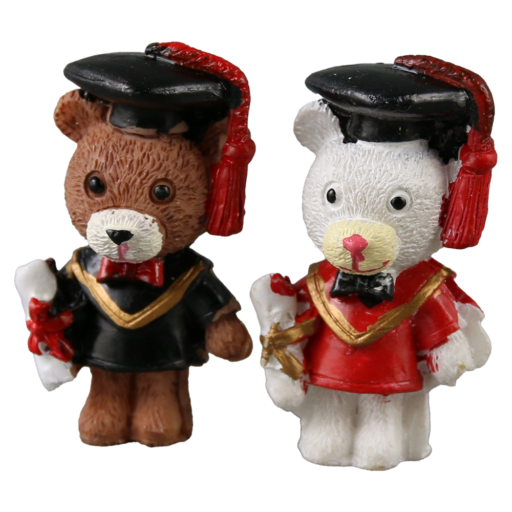 Set format din 2 ursuleti decorativi din rasina, unul maro si unul alb, 3 x 5 cm. Ideal pentru decor cadouri sau birou, adaugand veselie si simbolism pentru absolventi.