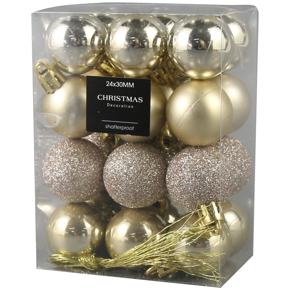 Set 24 globuri pentru brad, din plastic 3 CM, Crem/sampaniu/glitter