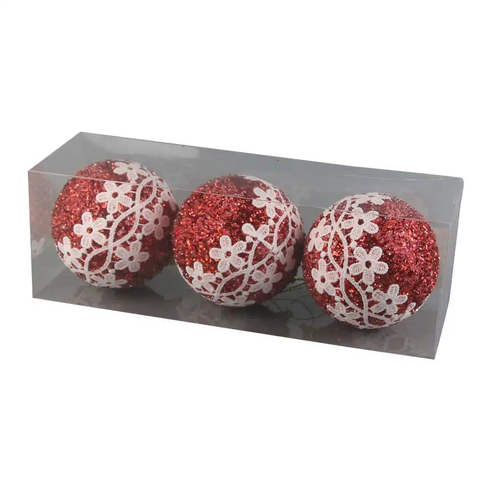 Set 3 globuri pentru brad din foam 8 CM, cu glitter rosu si dantela florala