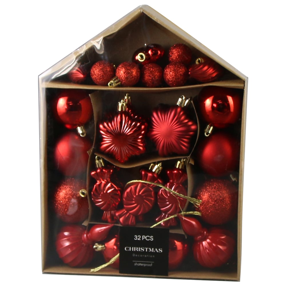 Set 32 globuri pentru brad, din plastic, rosu, Casuta