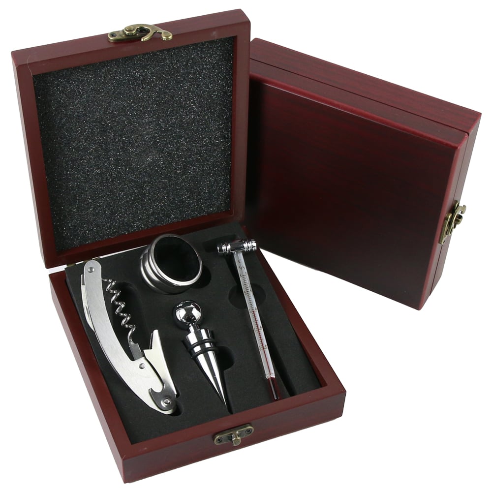 Set 4 accesorii pentru vin in cutie de lemn, 15×17 CM