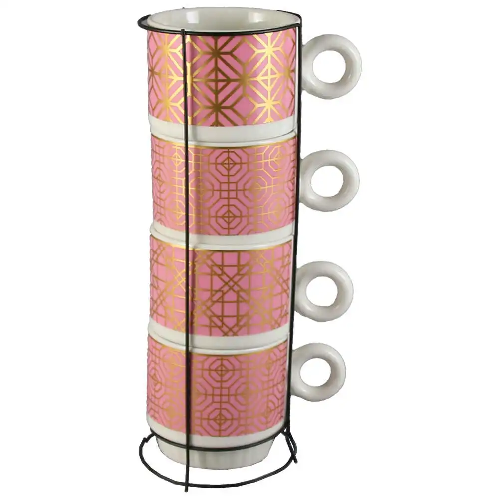 Set 4 cesti din ceramica cu suport metalic, 220 ml, Pink/auriu
