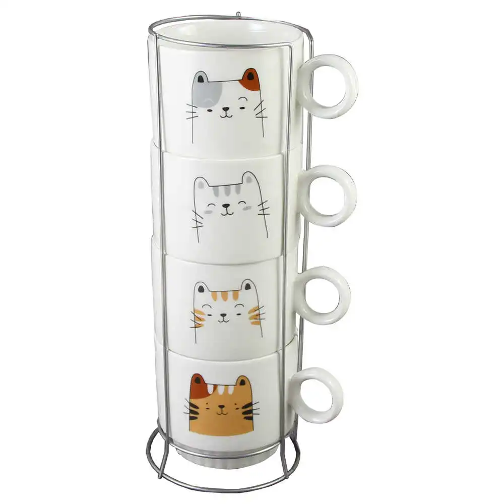 Set 4 cesti din ceramica cu suport metalic, 250 ml, Pisici