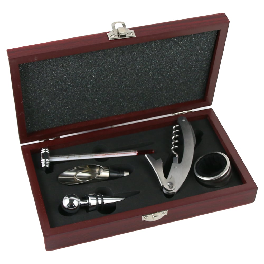 Setul contine accesorii pentru vin: dop, termometru, antipicurator, tirbuson si taietor de capison. Accesoriile sunt intr-o cutie cadou din lemn.