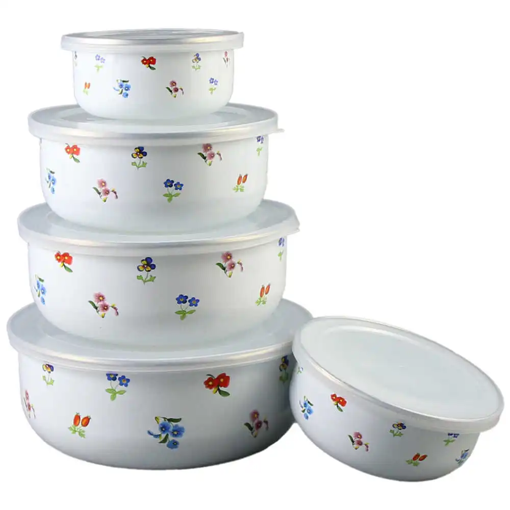 Set 5 boluri emailate cu capac din plastic, 18/16/14/12/10 CM, Flori colorate