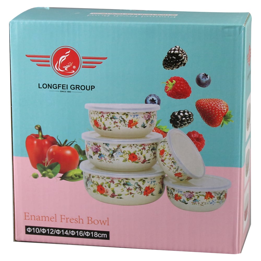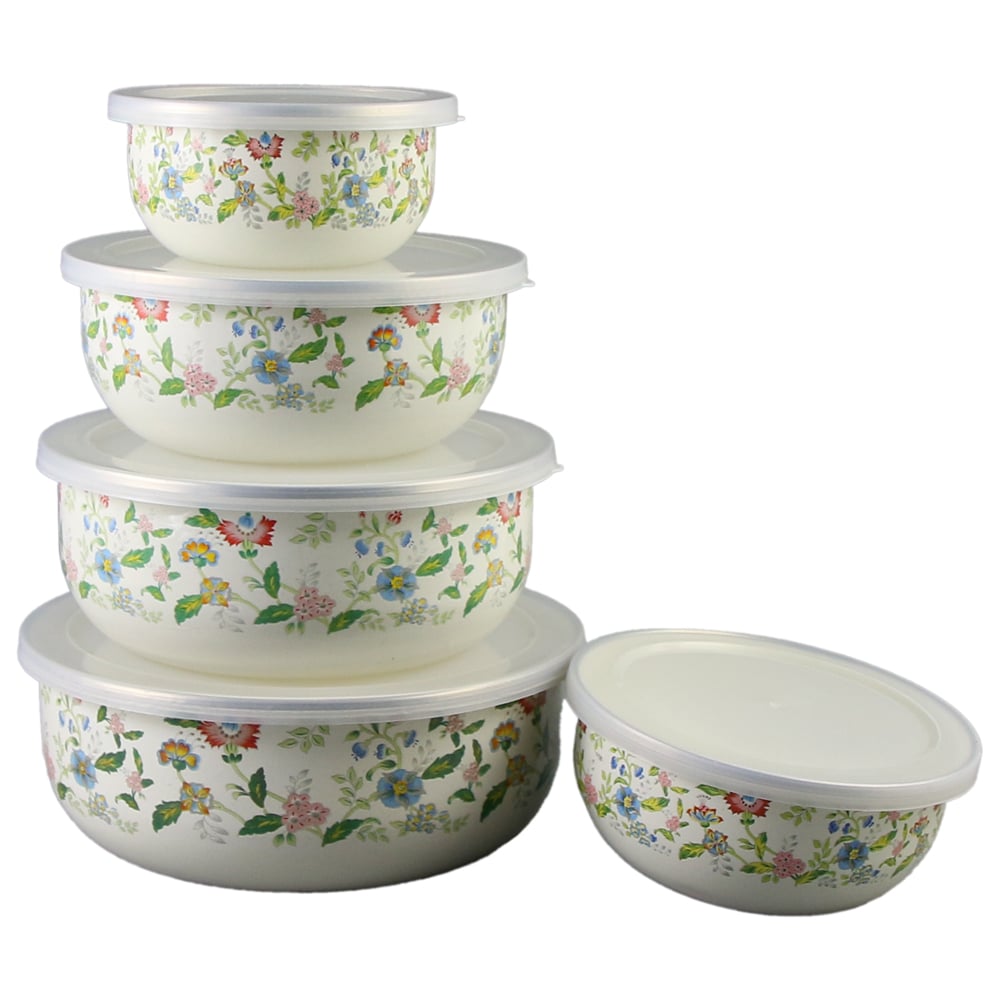 Set 5 boluri emailate cu capac din plastic, 18/16/14/12/10 CM, Flori