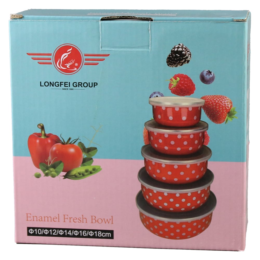 Set 5 boluri emailate cu capac din plastic, 18/16/14/12/10 CM, Rosu cu buline albe
