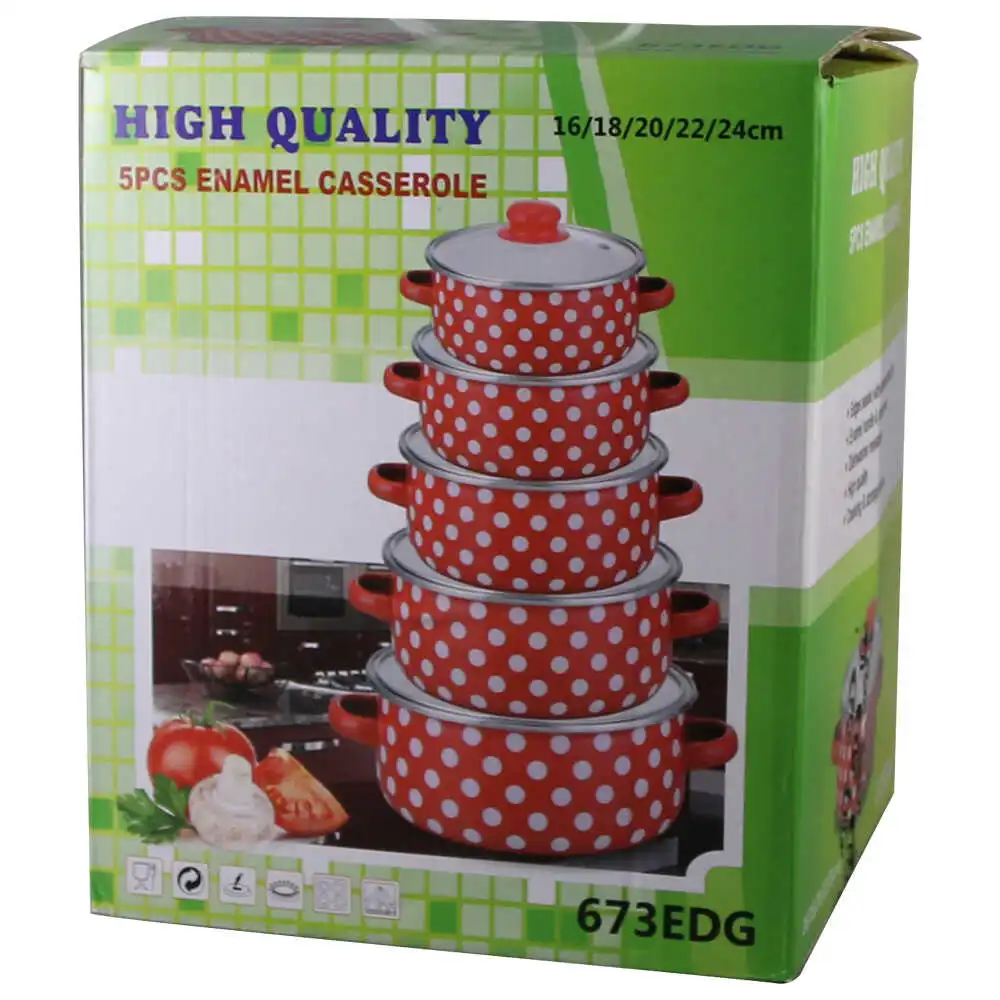 Set 5 cratite emailate cu capac, 24/22/20/18/16 CM, Rosu cu buline albe