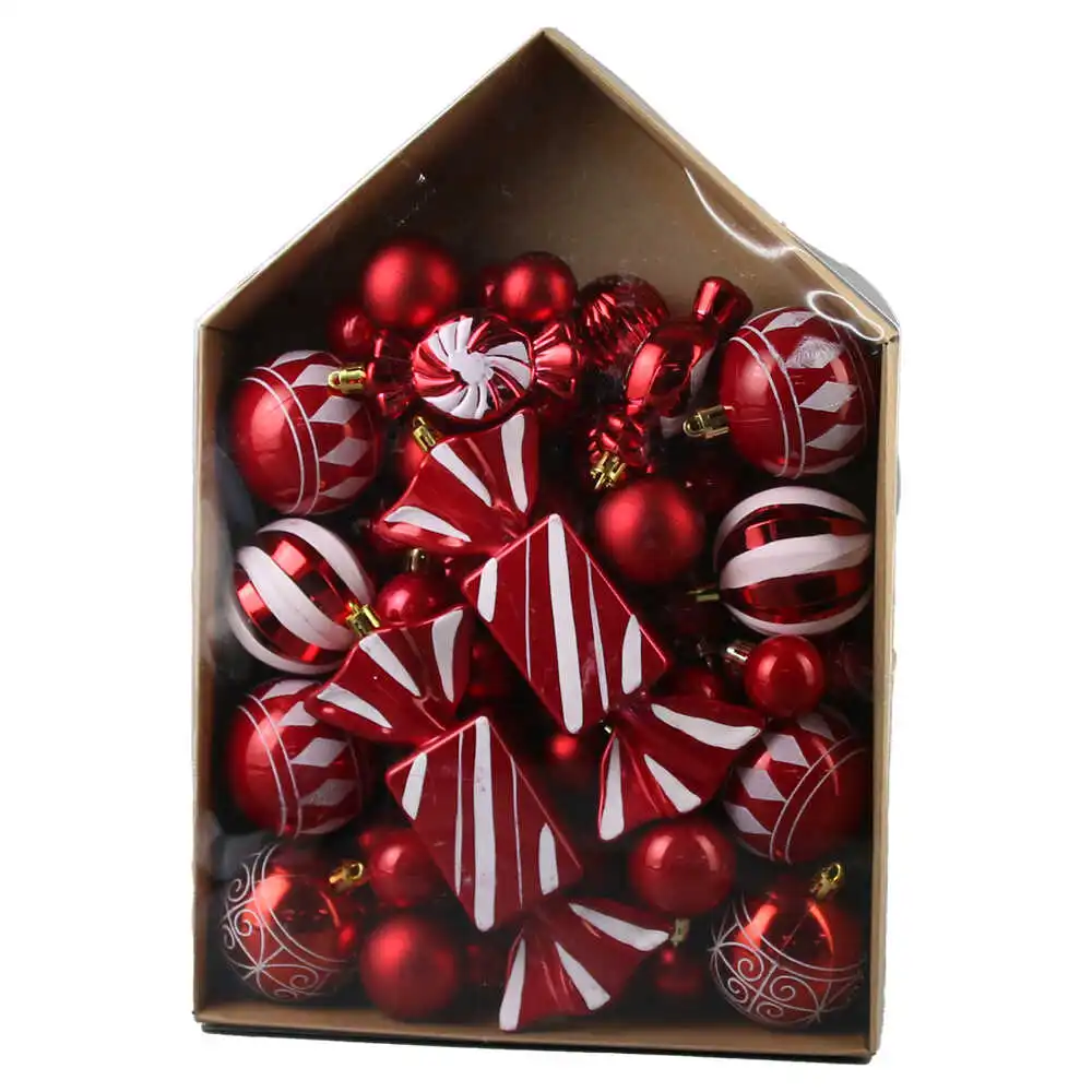 Set 58 globuri pentru brad, din plastic, rosu/alb, Casuta