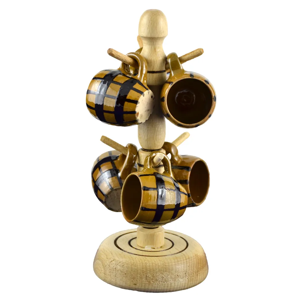 Setul respectiv alcatuit dintr-un suport realizat din lemn pe care sunt agatate 6 canite realizate manual din ceramica si pictate in forma de butoi, este un cadou ideal pentru iubitorii de arta populara traditionala. Totodata este potrivit si ca decor loc