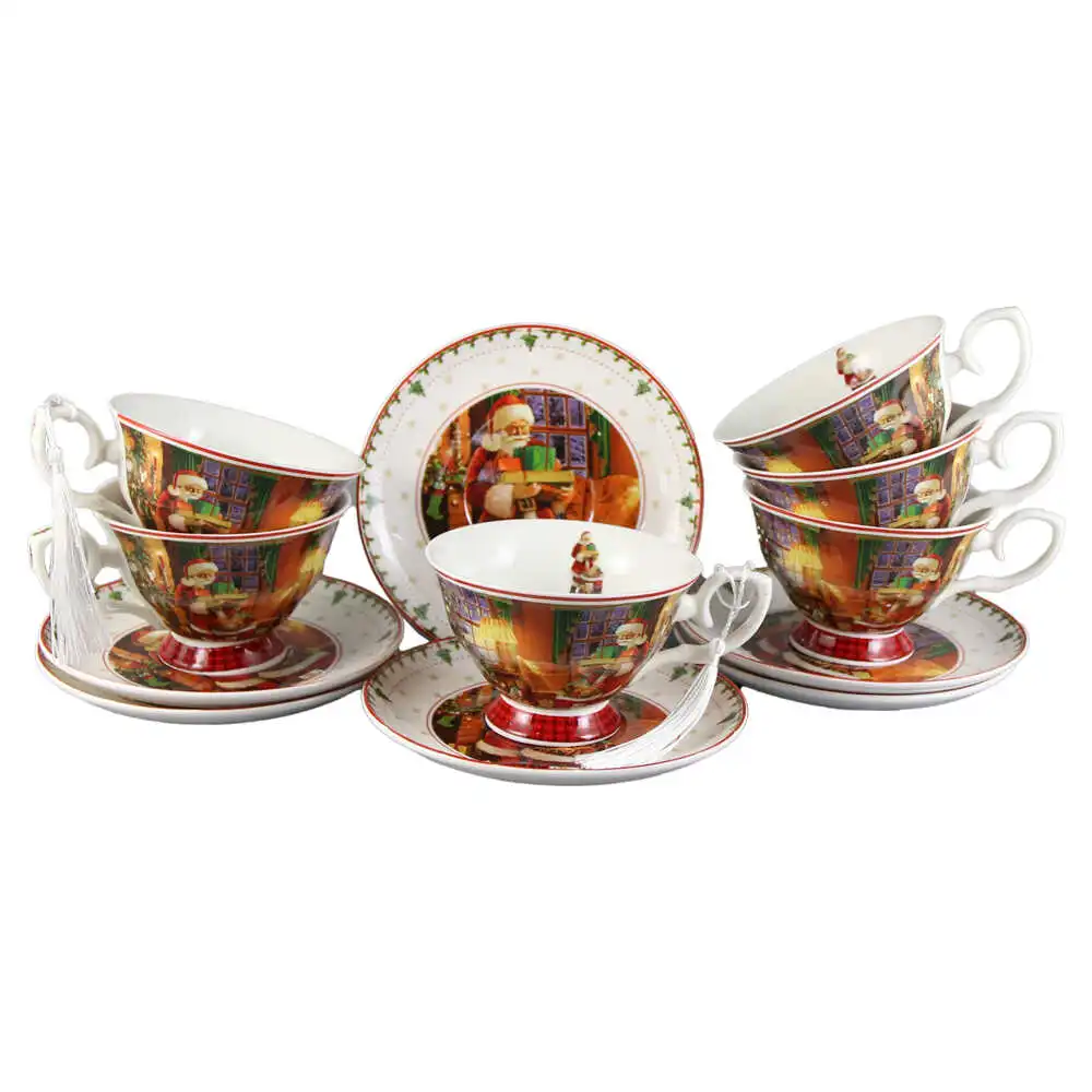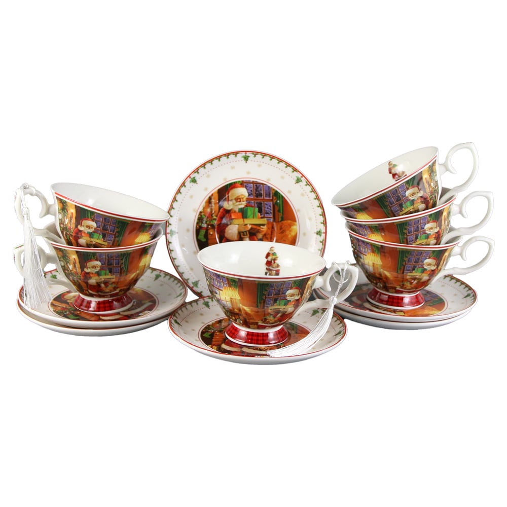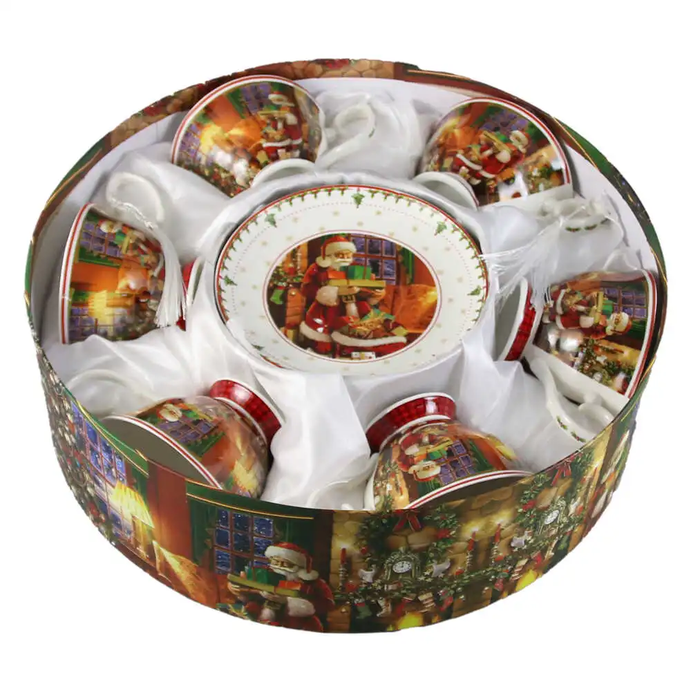 Set 6 cesti cu farfurii, din ceramica, 150 ml, „Mos Nicolae”, in cutie decorativa