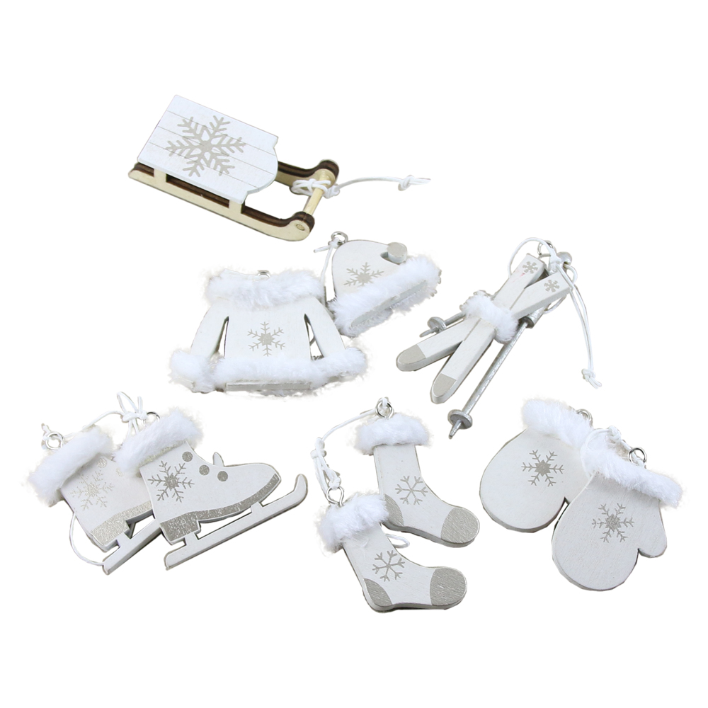 Set 6 decor Craciun din lemn cu agatatoare 5 CM, Alb/argintiu