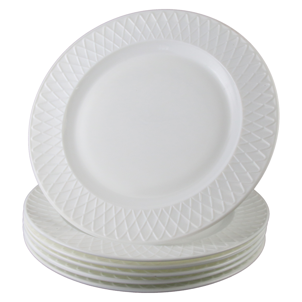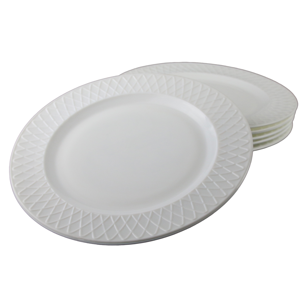 Set de 6 farfurii intinse din sticla opal alb, diametru 26.5 cm. Perfecte pentru servirea felurilor principale sau a gustarilor.