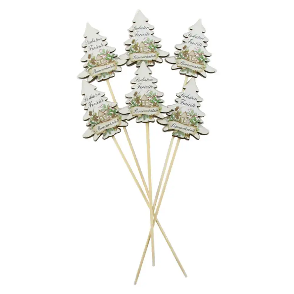 Set 6 Pick decor Brad de craciun „Sarbatori Fericite Binecuvantate” 6×24 CM