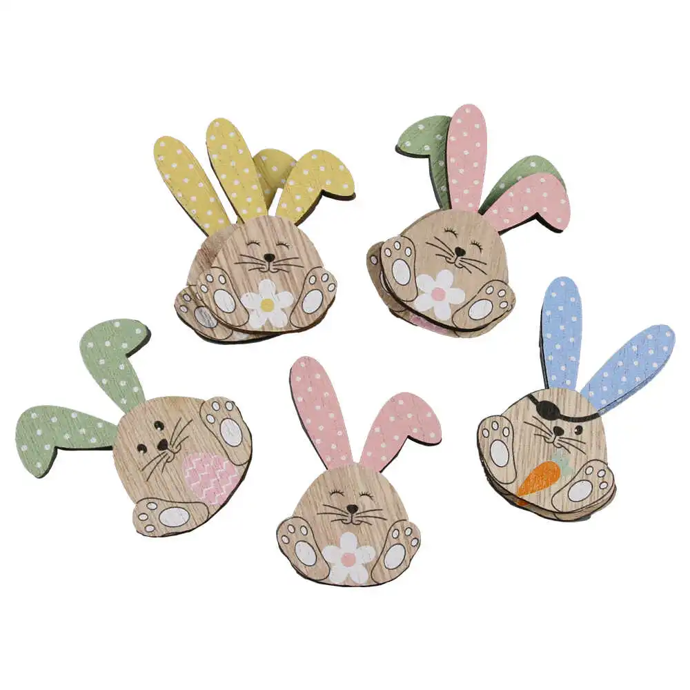 Set 8 decoruri lemn, 5 cm, iepurasi cu flori, cu autoadeziv
