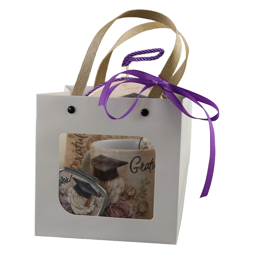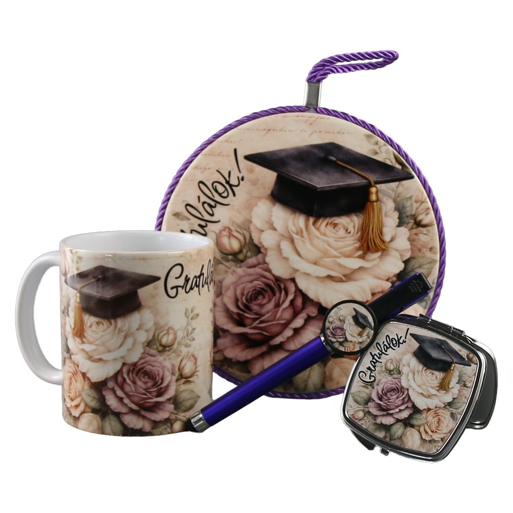 Set cadou pentru absolvire „Gratulalok”, format din cana ceramica 330 ml, oglinda metalica, pix touchscreen si decor de perete 17 cm, livrat cu punga cadou. Ideal pentru a sarbatori absolvirea si a oferi un cadou special.
