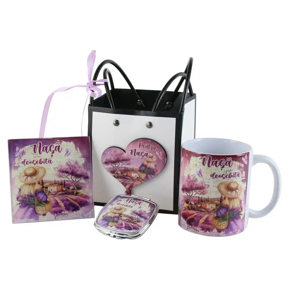 Setul contine: Cana ceramica 330 ml, oglinda buzunar din metal, suport pahar din sticla, punga cadou