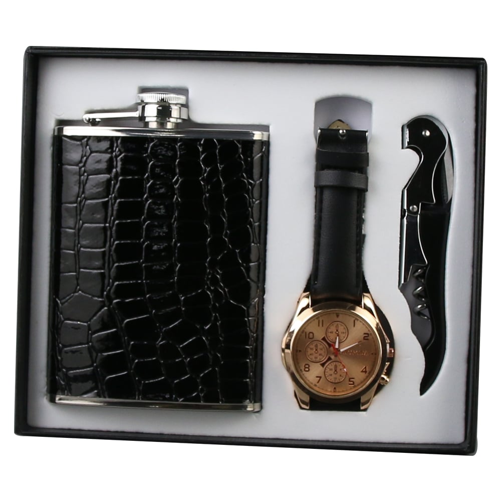 Set cadou pentru barbati, 3 piese, Plosca cu ceas si tirbuson