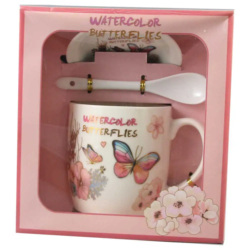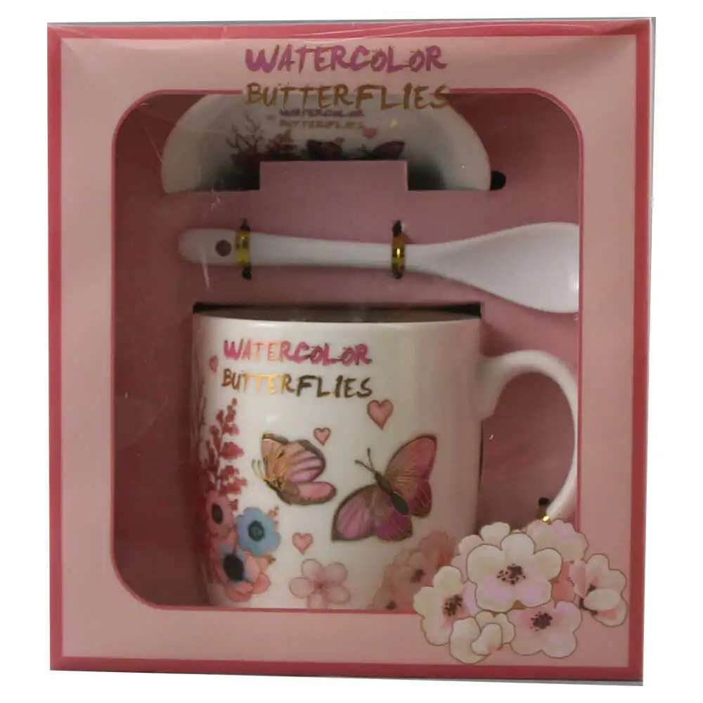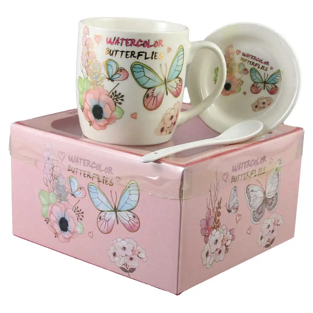 Set cana cu farfurie si lingurita, din ceramica „Watercolor Butterflies”, 300 ml, fluturas