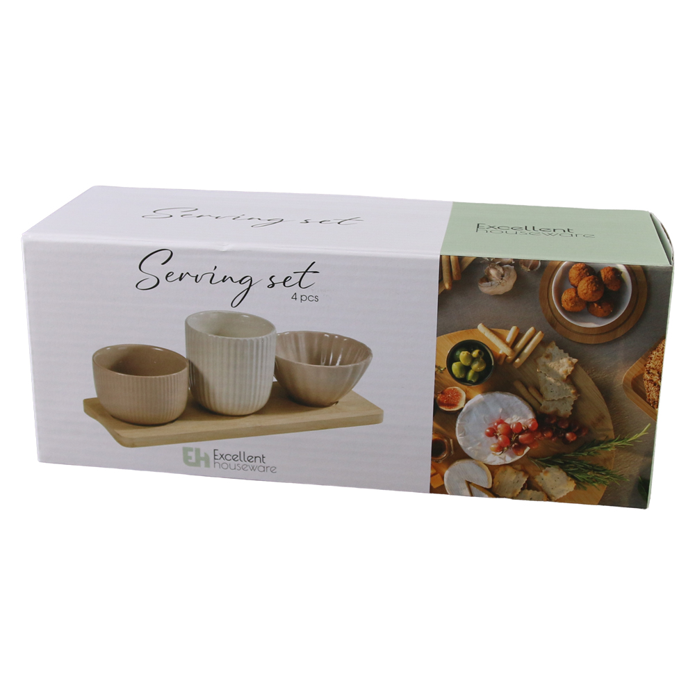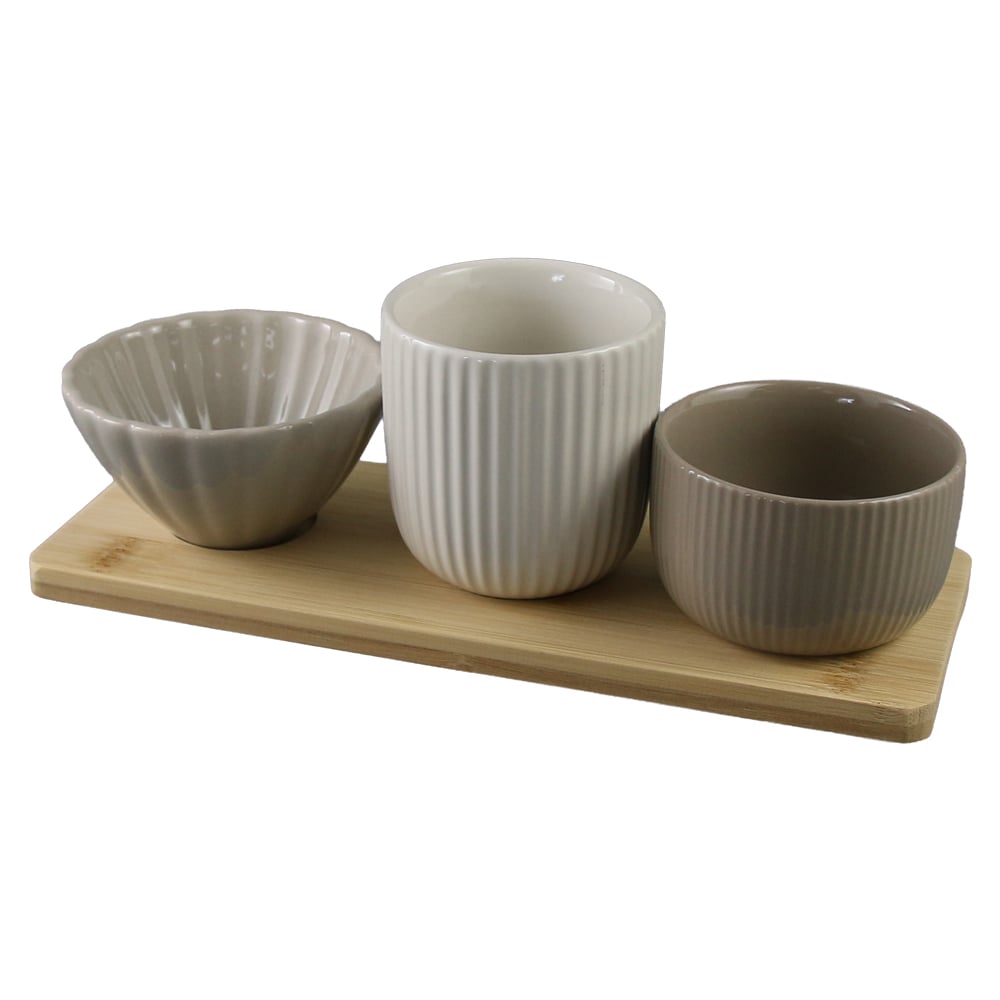 Set de servire cu 3 boluri ceramice si suport din bambus 25 x 9.5 cm
