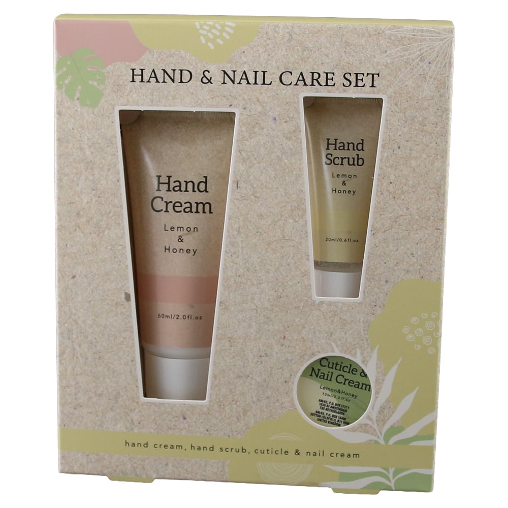 Set de ingrijire pentru maini si unghii, format din 3 produse: crema de maini 60 ml, scrub pentru maini 20 ml si crema pentru cuticule/unghii 10 ml. Disponibil in variantele Rose & Sandalwood si Lemon & Honey. Ideal pentru ingrijire zilnica sau cadou.