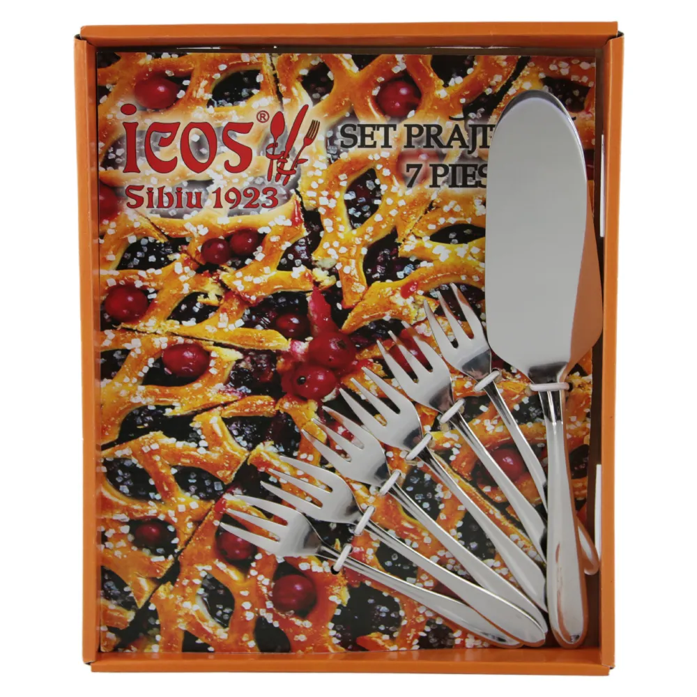 Acest set este format din 7 de furculite si spatula pentru tort, realizate din inox cu un design minimalist, se afla intr-o cutie elegant si poate fi un cadou ideal celor dragi.