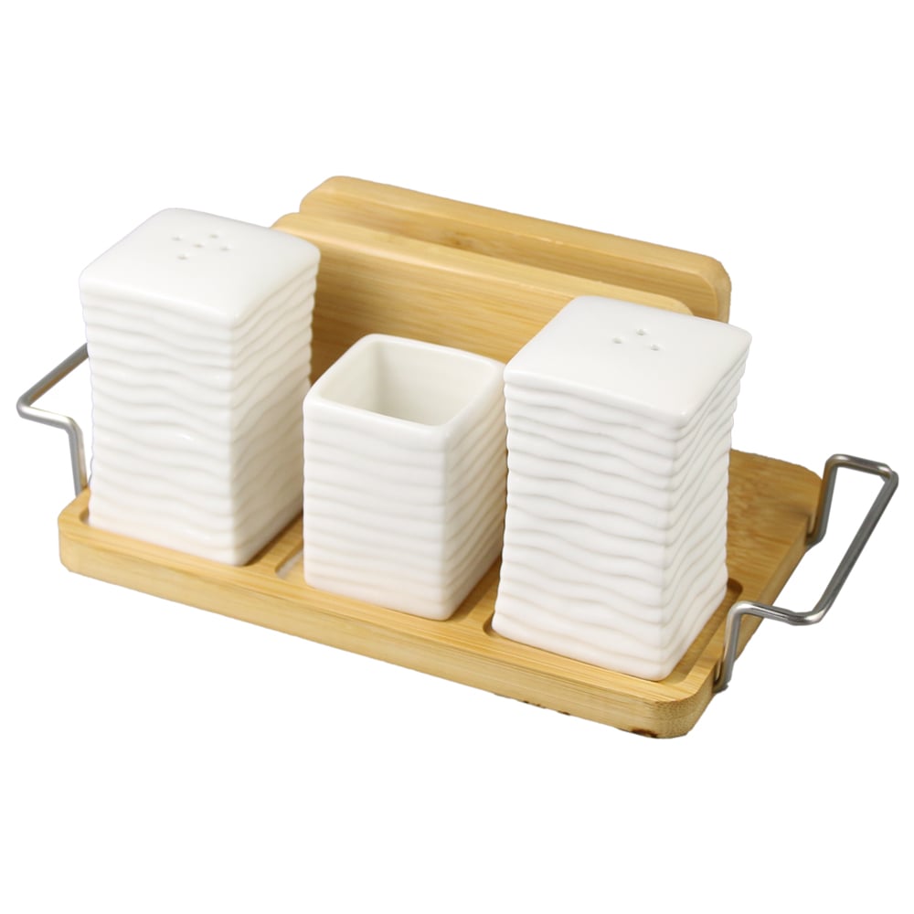 Set solnita ceramica cu suport pentru scobitori si servetele, din bambus