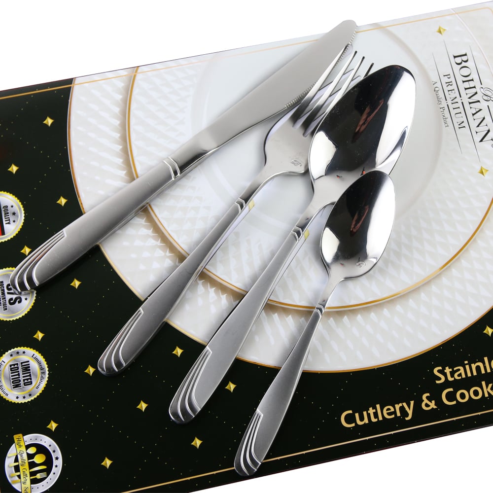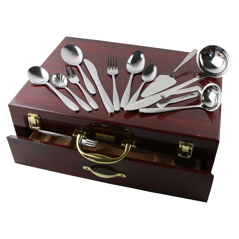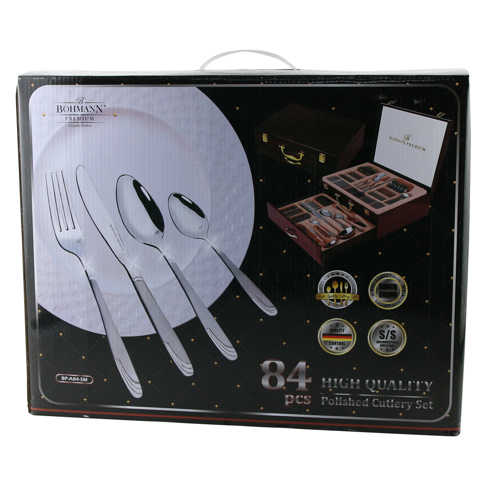 Set tacamuri inox 84 piese cu cufar din lemn, Bohmann Premium, Argintiu