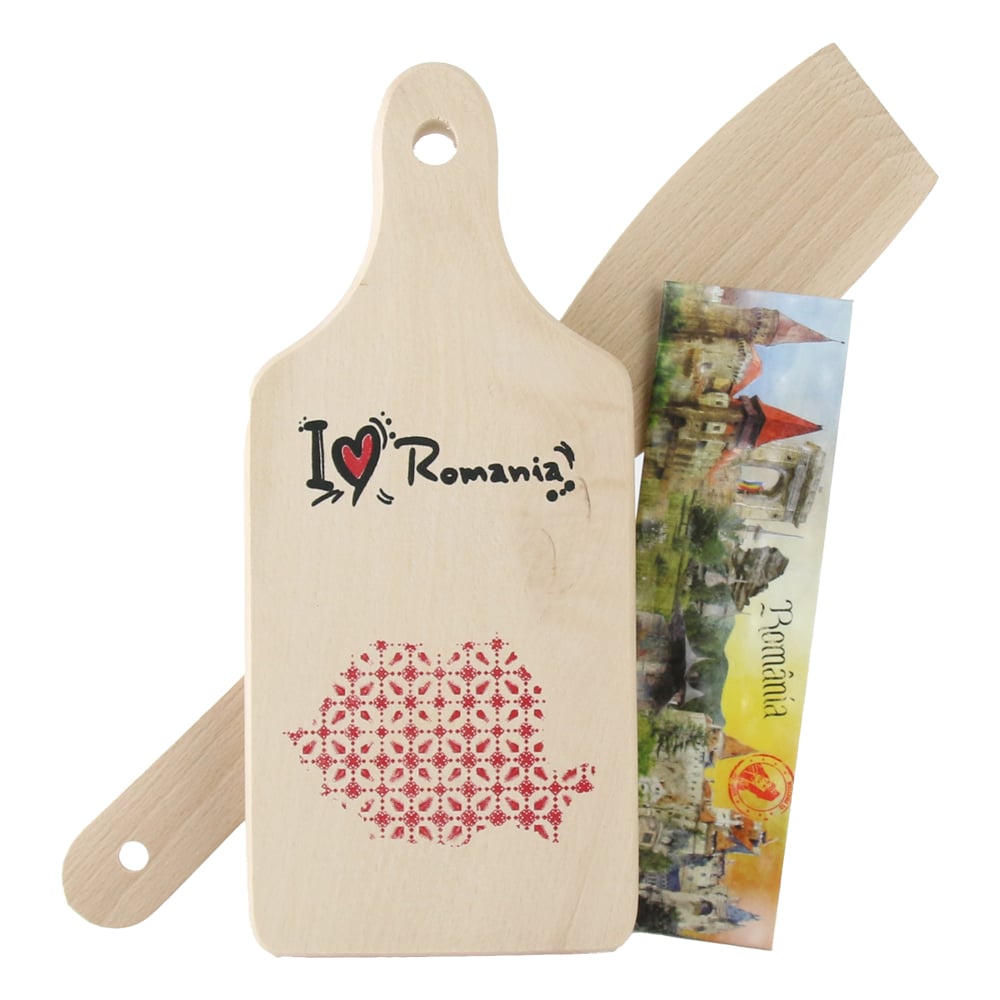 Set ustensile bucatarie din lemn cu magnet frigider „I love Romania”, 3 piese