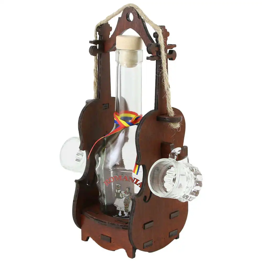 Suport din lemn Vioara cu o sticla si 2 pahare, „Romania”, 17×18 CM