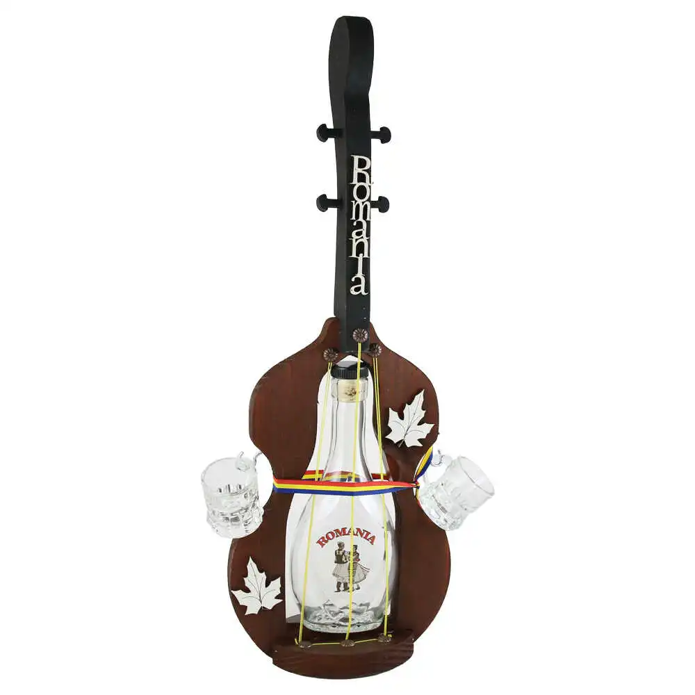 Suport din lemn Vioara, cu o sticla si 2 pahare, „Romania”