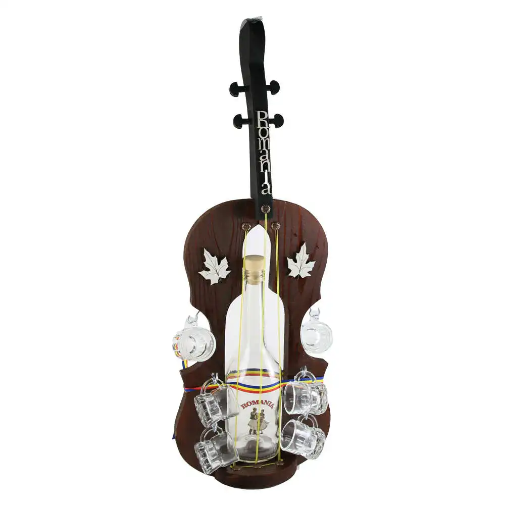 Suport din lemn Vioara, cu o sticla si 6 pahare, „Romania”