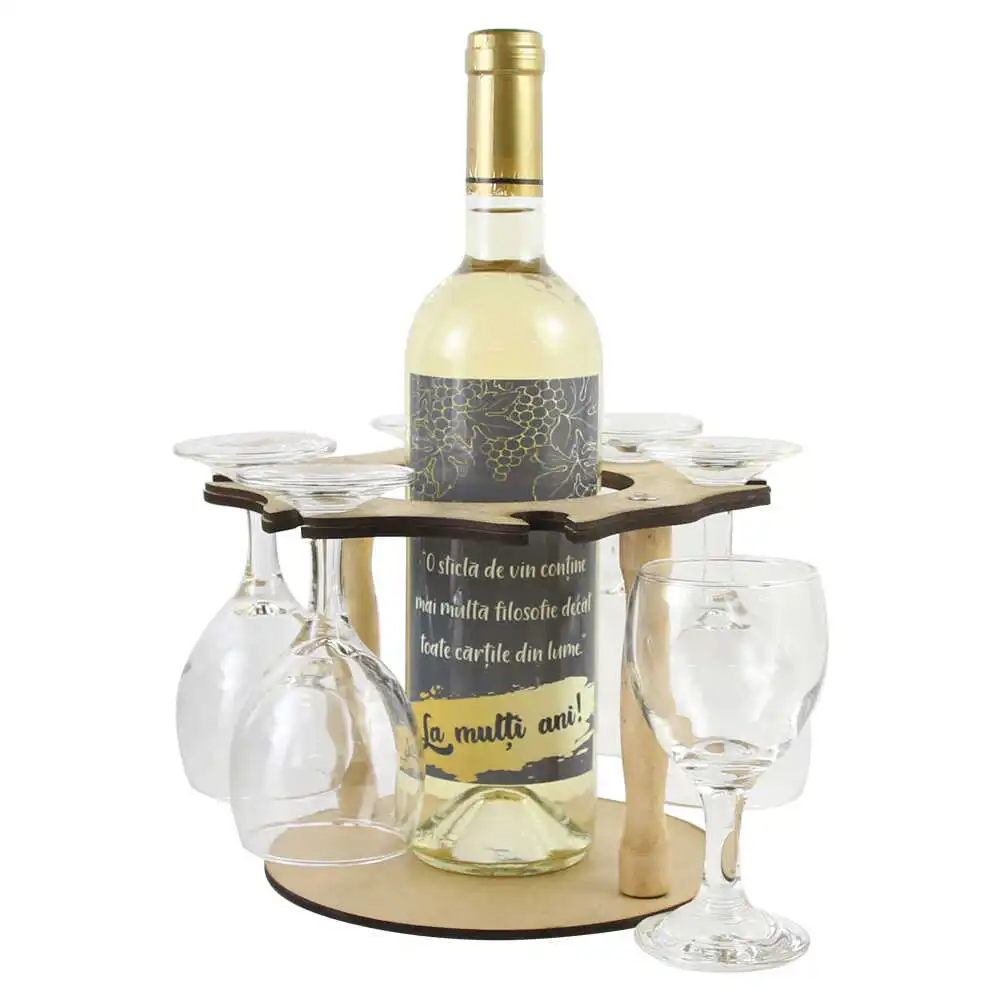 Suport lemn cu o sticla de vin si 6 pahare „La multi ani!”, 750 ml