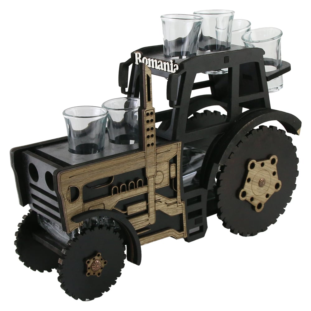 Suport decorativ din lemn, in forma unui tractor, conceput pentru a transporta o sticla si 6 pahare, cu dimensiunile de 34 x 27 cm, cu tematica „Romania”. Ideal pentru cadouri tematice, prezentari festive sau decor rustic.