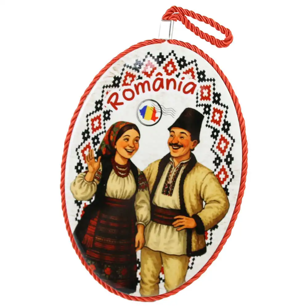 Suport oale decor din ceramica „Romania”, 14×20 CM, Cuplu in port popular