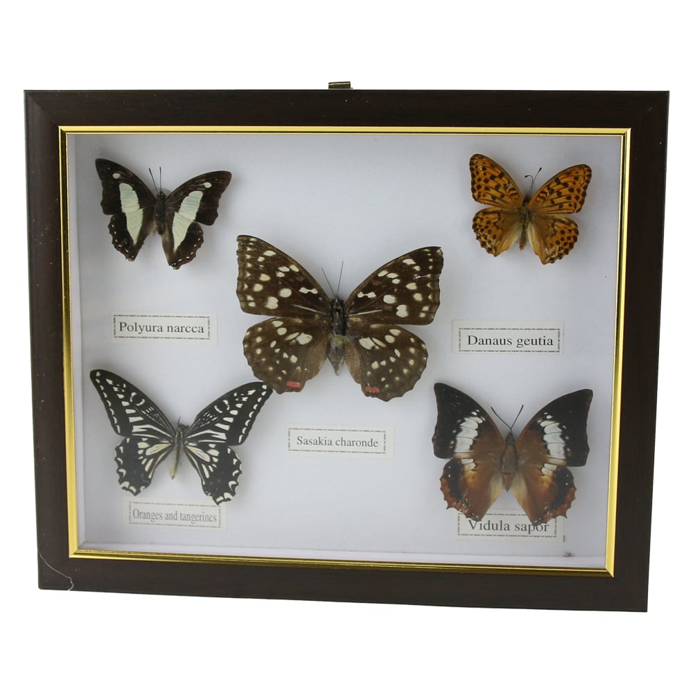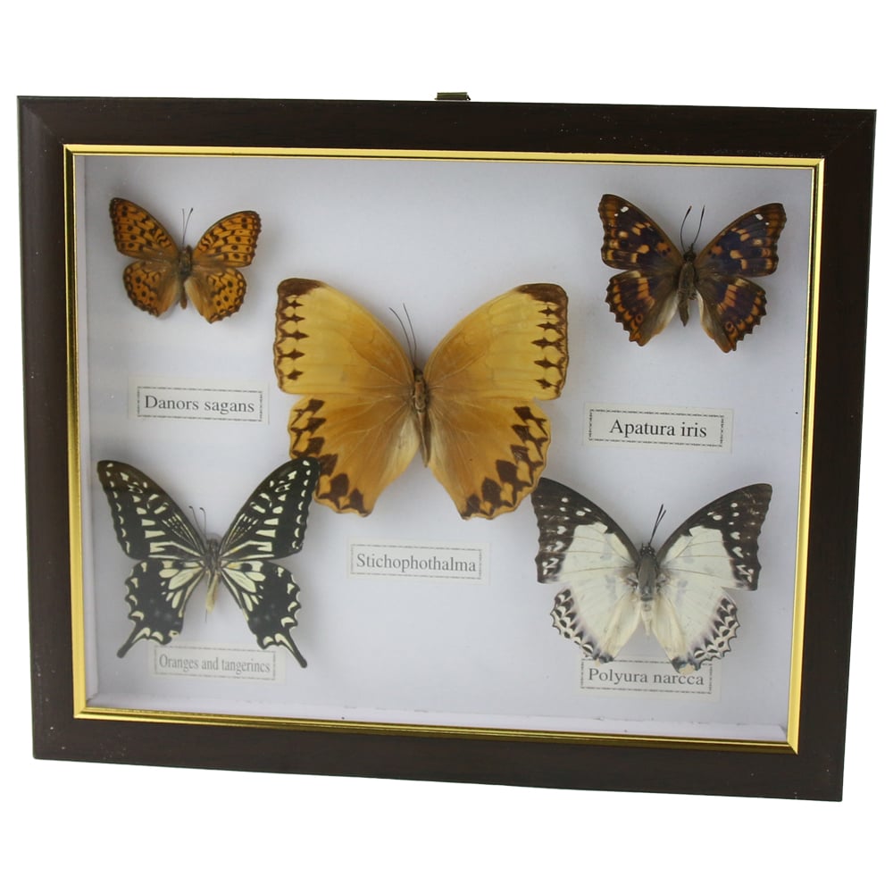 Tablou decorativ cu 5 fluturi naturali, cu dimensiunile de 28 x 23 cm, disponibil in modele variate. Ideal pentru decorarea casei, biroului sau pentru a oferi un cadou original.