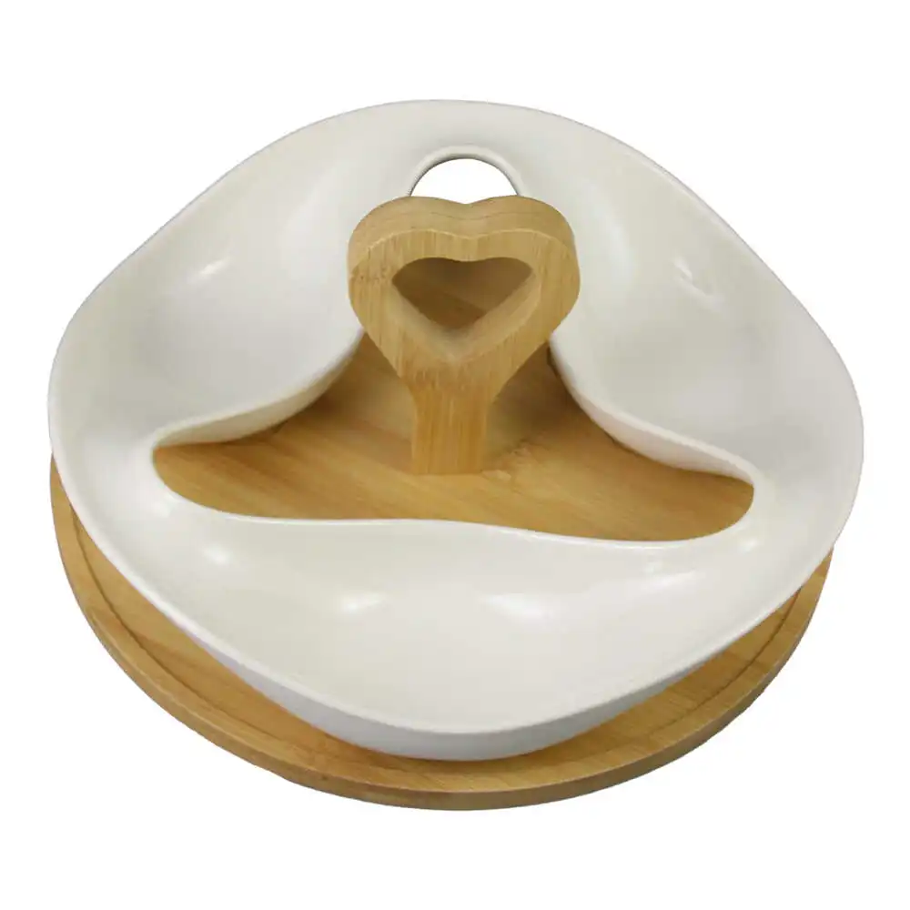 Tava din ceramica cu 3 compartimente, si suport bambus 26 CM, White