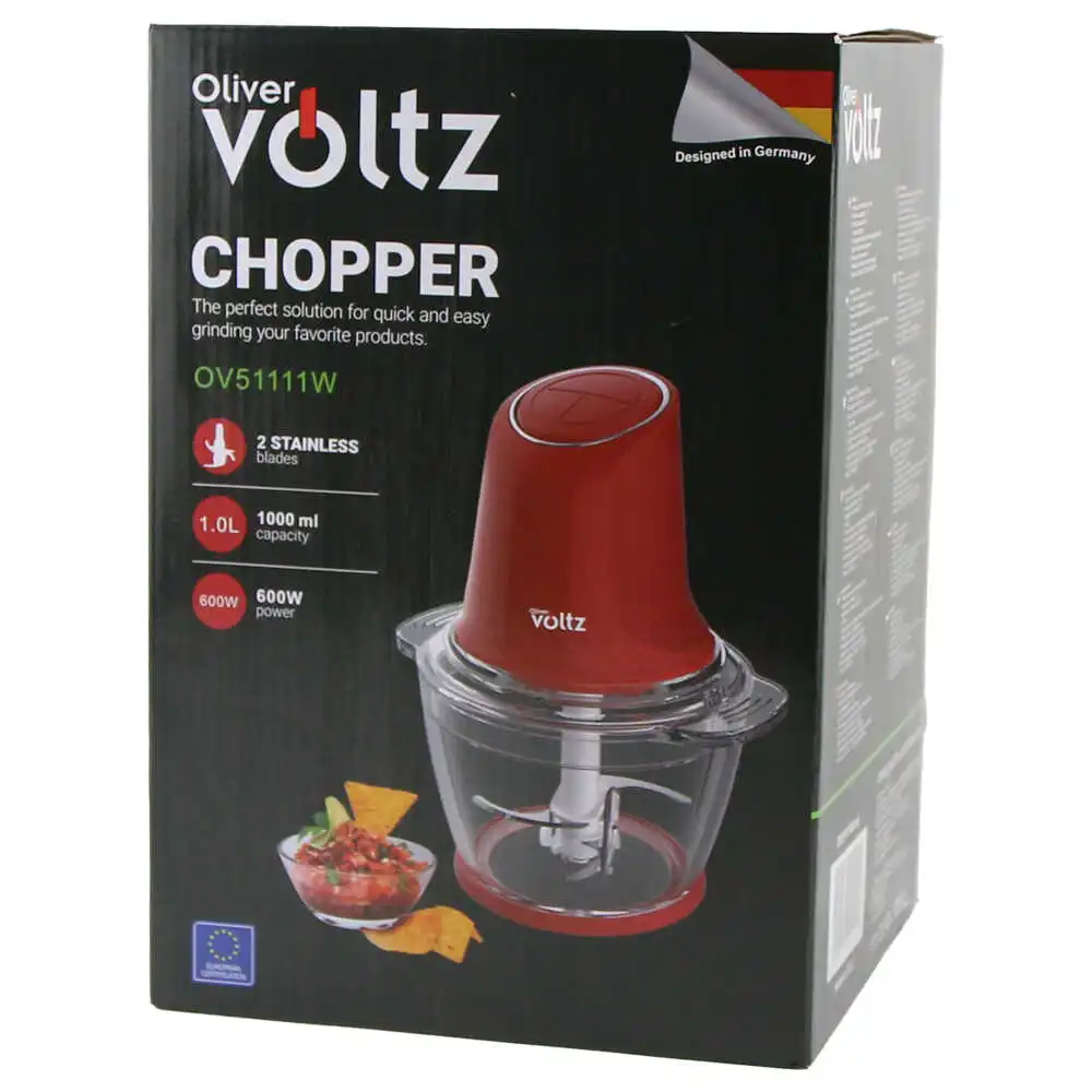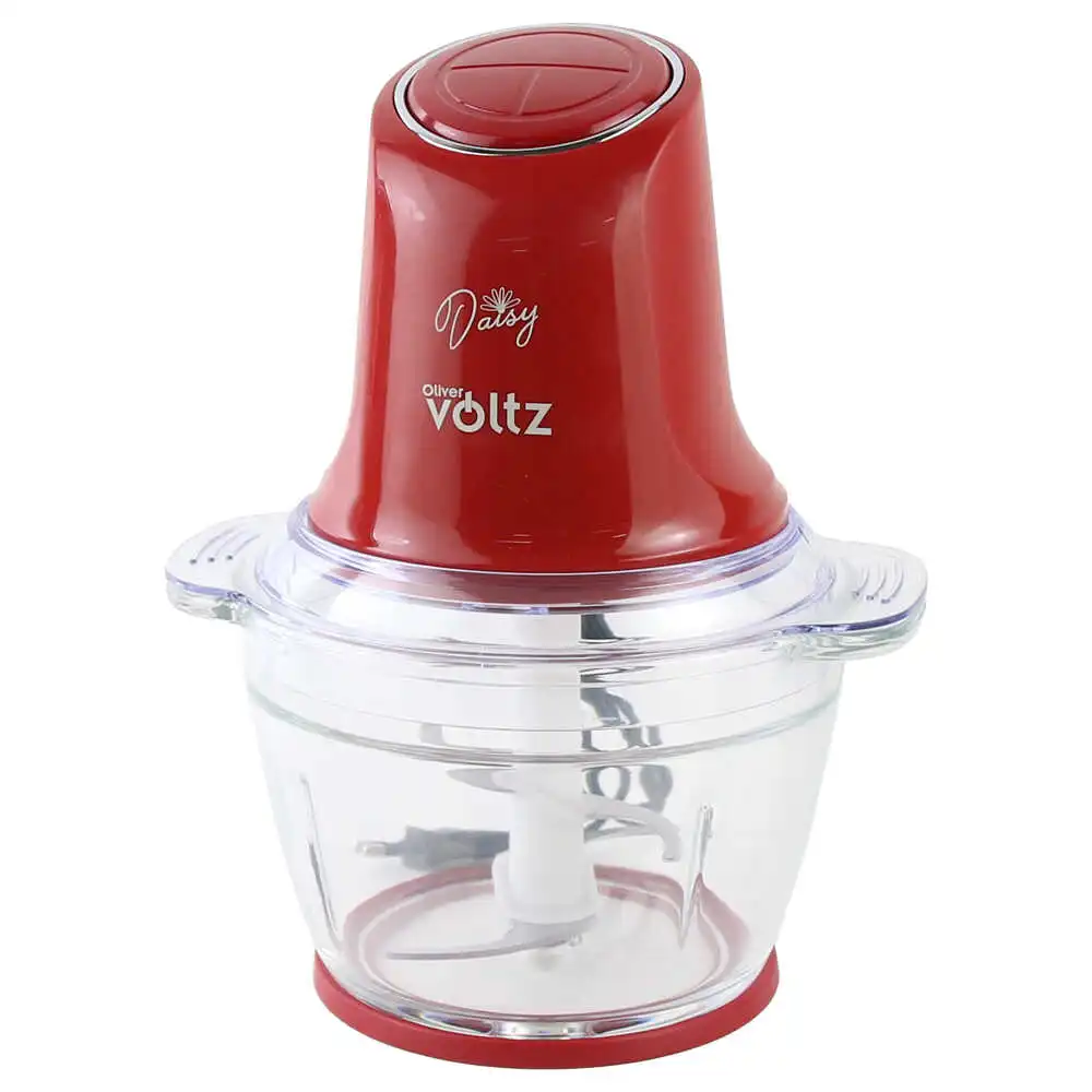 Tocator/chopper electric cu bol din sticla 1 L, 600W, Voltz Daisy, lama dubla din otel, rosu