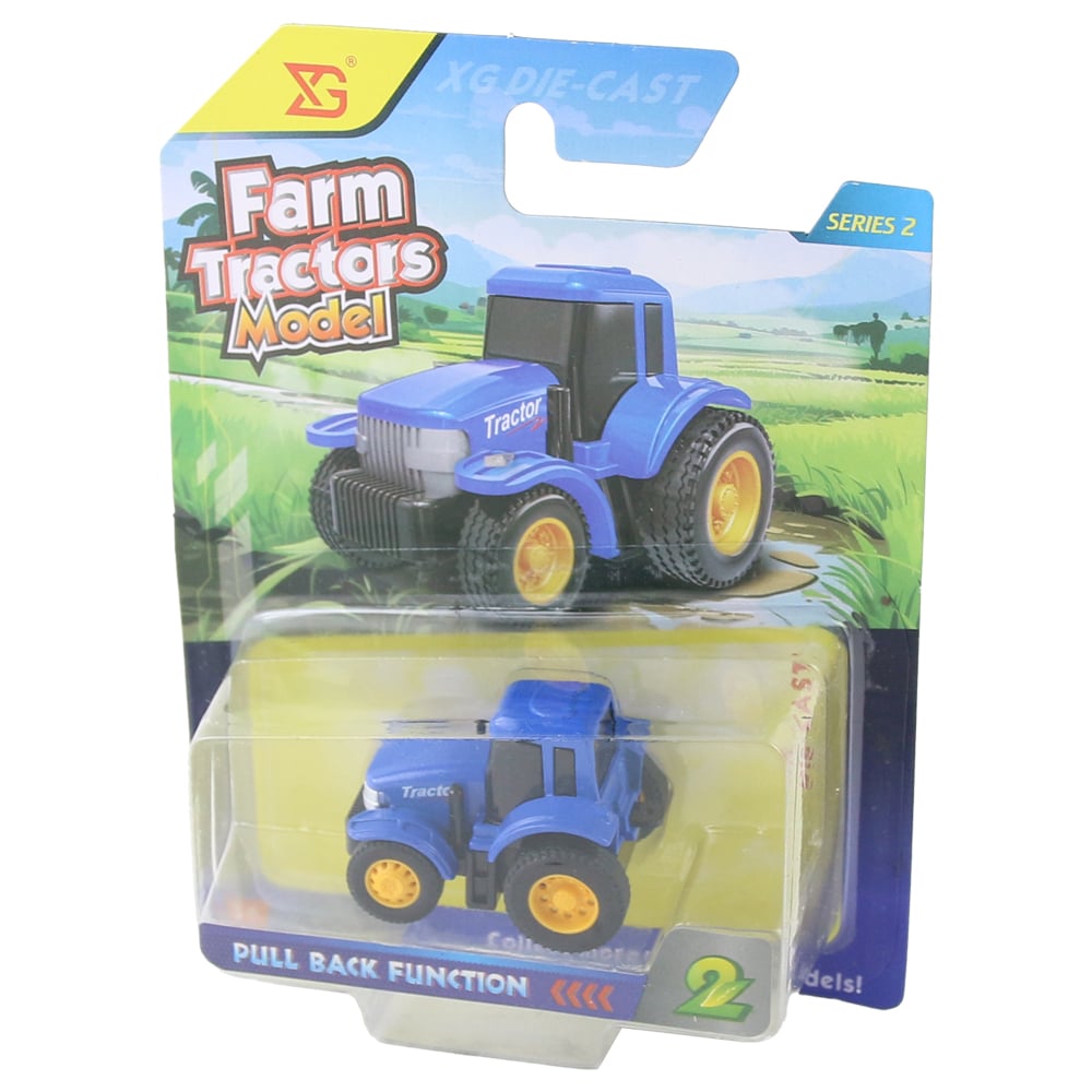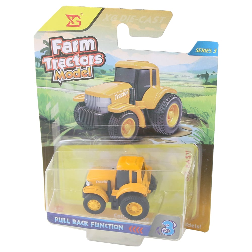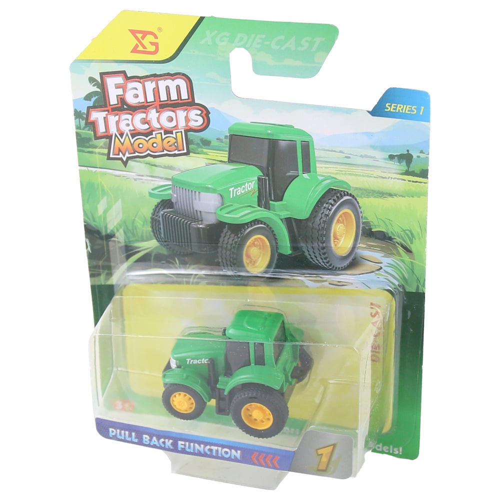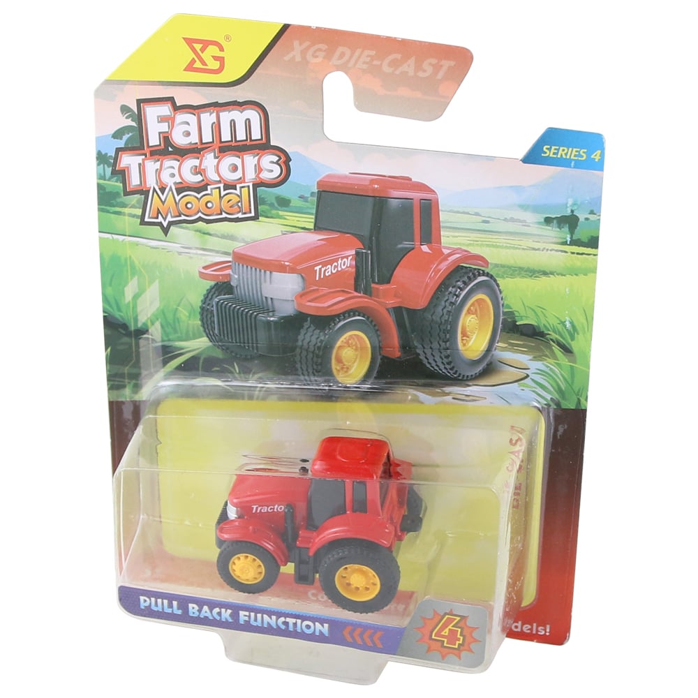Tractor din metal, cu mecanism de frictiune, dimensiuni 5 x 3 cm, recomandat copiilor de peste 3 ani. Ideal pentru joaca interactiva si dezvoltarea coordonarii motorii, oferind distractie si realism in miniatura agricola.