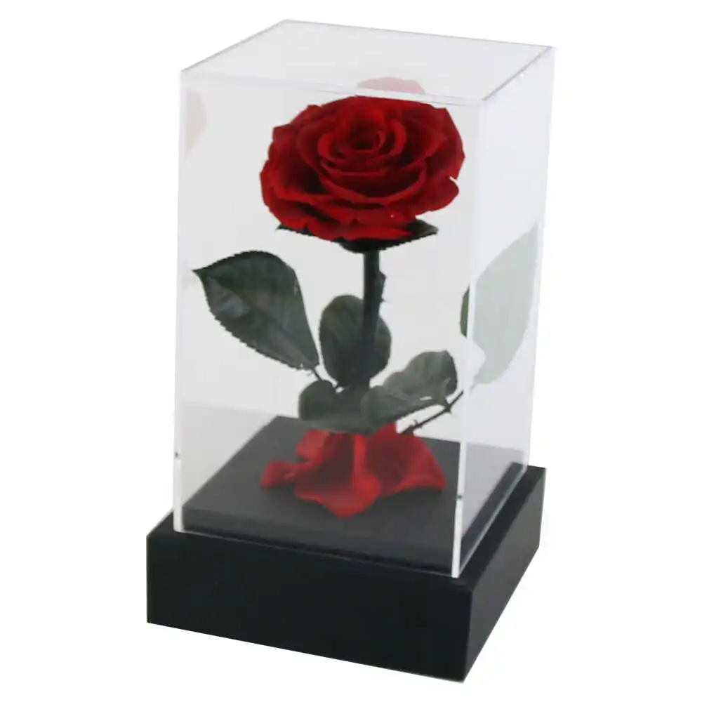 Trandafir rosu in cutie transparenta, cu suport lemn 12×20 CM
